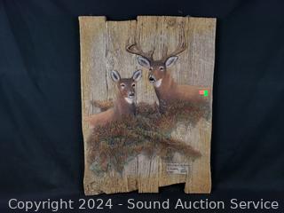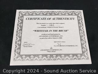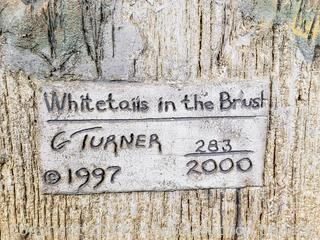 Bowl is 13" x 17" x 13", has some chips. Art is titled "Whitetail in the Brush", #283/2000, 24" x 18", comes with CoA.