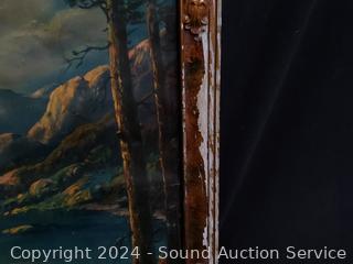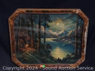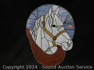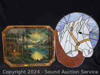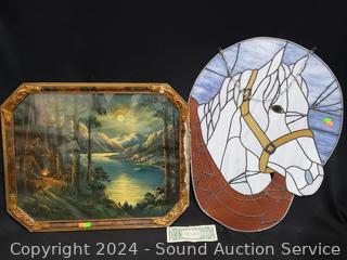 Lot #0114: Vintage Camping Mt. River Scene Print & Stained Glass Horse Window Decor