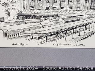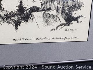 "Seattle Kingdom", Ferry Bridge, "King Street Station", "Mount Rainier Overlooking Lake Washington". 8" x 10" & 14" x 18". Framed, matted with glass. Refer to photos for more details.
