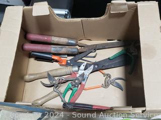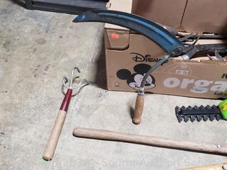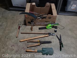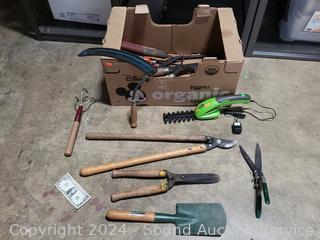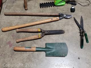 Cordless hedge & grass trimmer, loppers, trimmers, hand scythe, pruners, cultivators, shovel, etc. Refer to photos for more details.