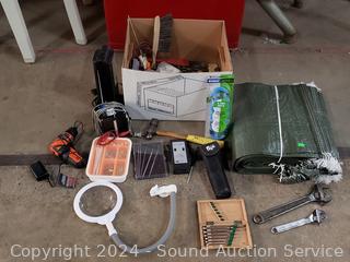 Sandbag...bags, Pakistan folding knife, Ott-Lite Task Light (works), Post slide rule, dental stainless picks, digital thermometer, Black & Decker Pivot 3.6v cordless driver, Precut trimmer line, pall peen hammer, hardware & more. Refer to photos for more details.