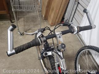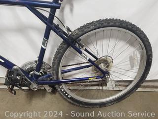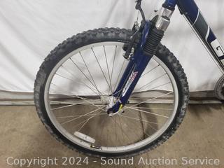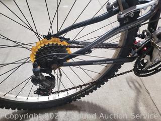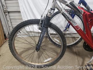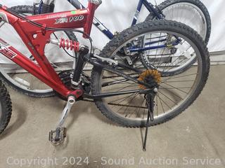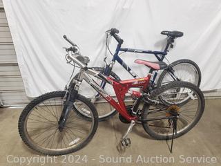 Mongoose Aluminum Alloy XR 100 26" Mountain Bike - Front & rear suspension, cantilever brakes, 21-speed, grip shift. Various weathering, rust, wear to finish. Large gears left shifter has some damage, not shifting. Tires are holding air, some cracking. GT Palomar - Front end suspension, cantilever brakes, grip shift, 21-speed, everything appears to be functioning as intended.