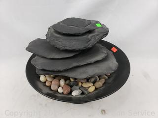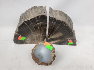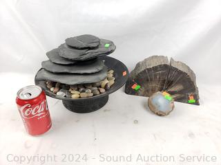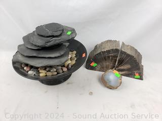 Lot #0141: Tiered Stone Tabletop Fountain, 2 Stone Bookends & Geode