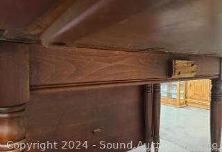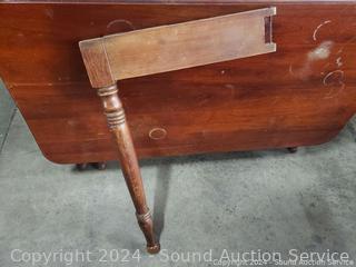 One gate leg is missing, and the other is detached, failing to support the leaves. The piece has multiple scuffs, discoloration spots, and finish wear. Dimensions are 29" H x 46" W x 20" D, with two 24" drop leaves. Please see the photos for more details. An excellent project piece!