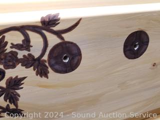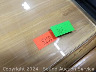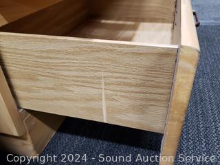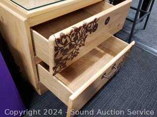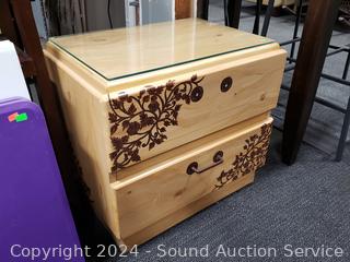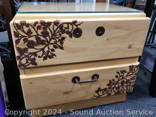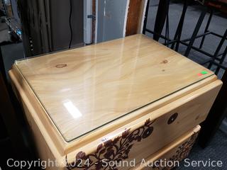Missing a drawer pull. Has a protective glass top. 21" H x 23.75" W x 16" D.