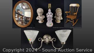 309 Lots including Ivory Sofa/Loveseat/Armchair, Dold Grandfather Clock, Black Powder Pistols, Wood Slab/Log Accent Tables, Curio Cabinets, Unique Bronze Forged Chairs, Log Bench, Fine Art Oil Paintings, Log Chest & Nightstand, Refrigerator/Freezer, Oak Hutch, Garden Bench, Assorted Nascar Collectibles (Some Autographed), Assorted Sound/Home Theater Equipment, Sewing/Quilting Fabric, Household Goods & Much More!!!