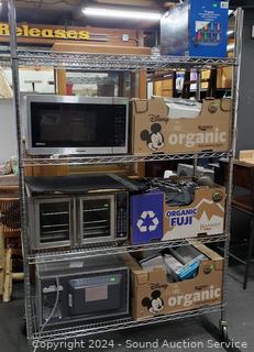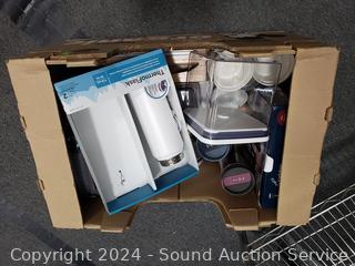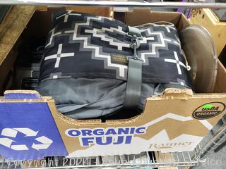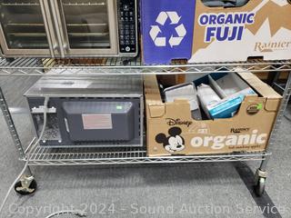 Microwave, cordless deep tissue massager, Pendelton outdoor blanket, travel bottle, acrylic food storage container, french door air fryer oven, entrance rug, holiday string lights & more. ATTN: Items may be missing pieces, damaged, not functioning, complete, no issues, etc. All items as is. Refer to photos for lot contents. Cart NOT included.
