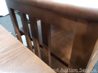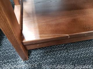 Has a split on the bottom shelf that has been repaired, overall great condition. 22" H x 48" L x 20".