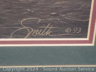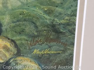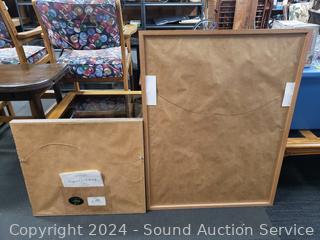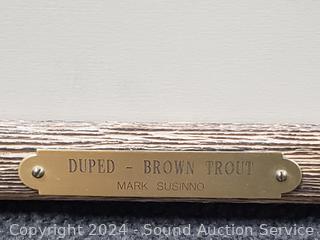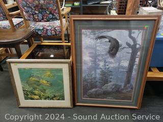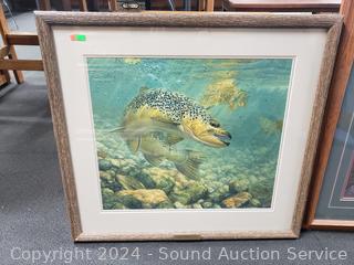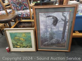 Both framed, matted with glass. "Brown Trout" by Mark Susinno #337/850, 24" x 26" with CoA & original purchase receipt. Eagle print by Smith '93, 41" x 33".
