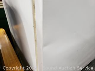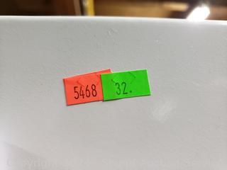 Scuffs, dings, wear to finish, missing kick plate. Could use a proper cleaning. Appears to be functioning as intended. Don't see model or serial. 66" H x 30" W x 27" D.