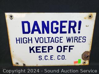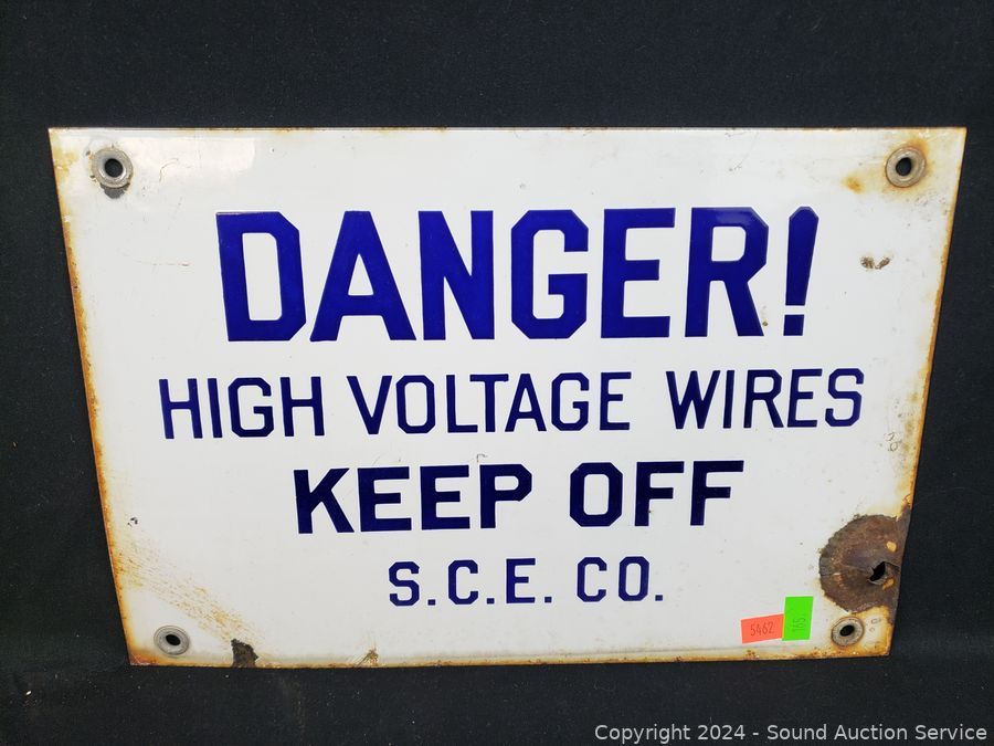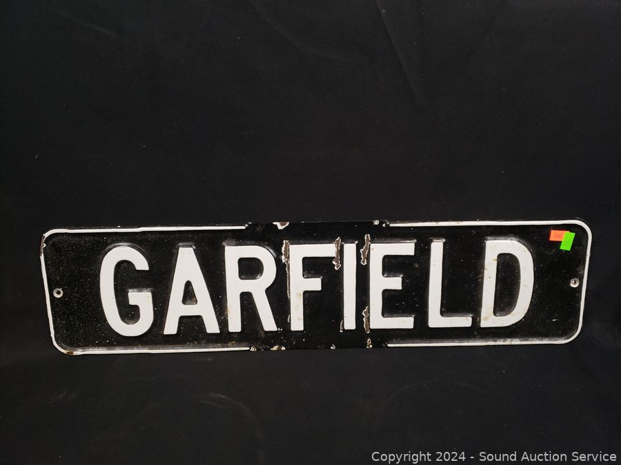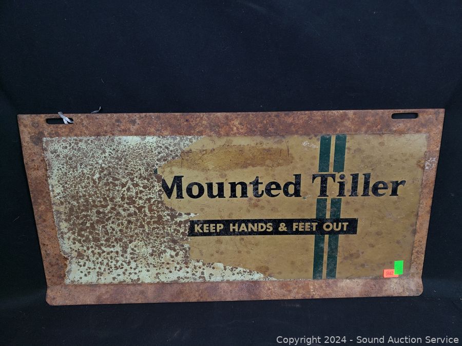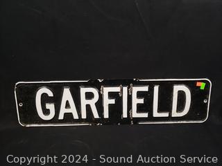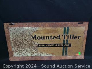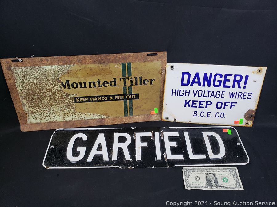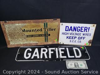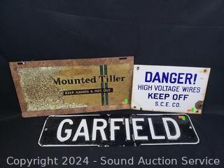 6" x 24" Garfield sign, 8" x 12" Danger High Voltage sign, 9.5" x 19" Mounted Tiller sign. Various rust, wear. Refer to photos for more details.