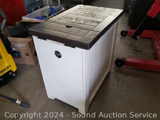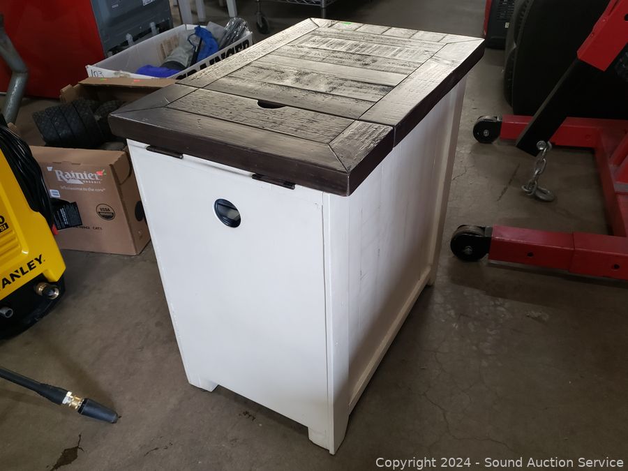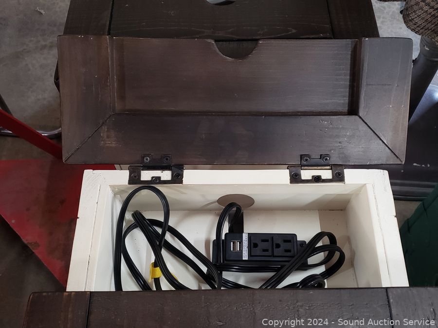 2 USB outlets, 2 power outlets built into the top. Some minor scuffs, right side hinge is a little loose, overall great condition. 24" H x 16" W x 24" D.