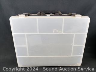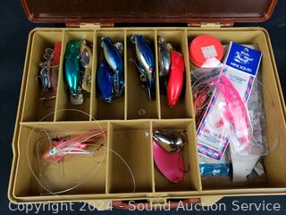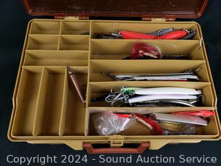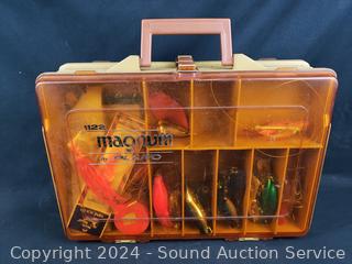 5" x 14.5" x 11" empty case, Plano Magnum case full of lures, 13.5" x 9" x 4.25". Refer to photos for contents of Fisherman's accessories kit.