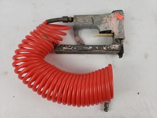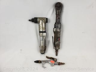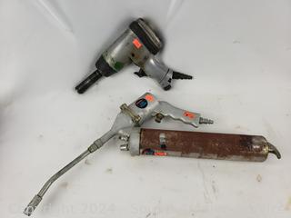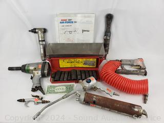 Mac Air Tool grease gun, Allied Pneumatic 1/2" impact, Mark-1 3/8" ratchet, Air Nibbler, Stapler, 1/2" drive impact sockets, air sprayer, coil hose. 4 work, 2 are untested, air nibbler & wrench (don't have the proper fittings). Several with manuals.