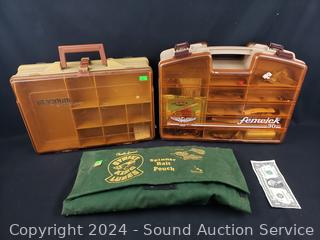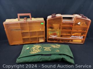 Pouch and Plano both have lures, Fenwick is empty. 9.25" x 13" x 4.25" & 11" x 14.5" x 4.5" cases.