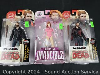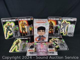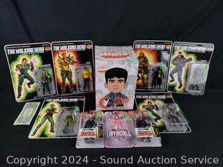 Invincible figures, 8 The Walking Dead action figures, 1 Outcast Minis figure. All in original packaging.