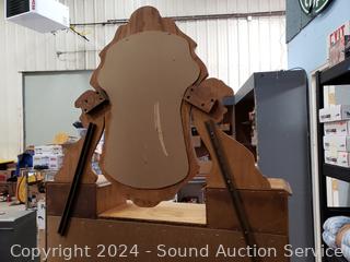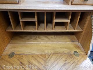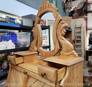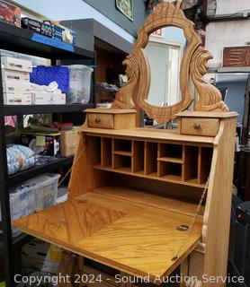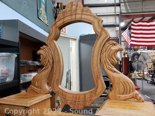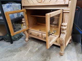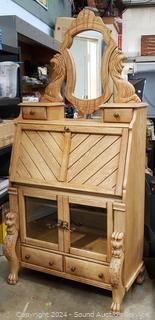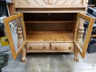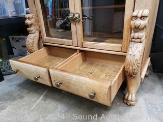 Lot #0035: Unique Oak Claw Foot Mirrored Lionhead Accent Secretary Cabinet