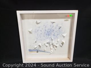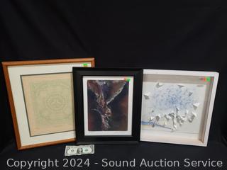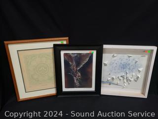 3D Geometric abstract artwork, signed (unable to make out), dated 2017, 16.5" x 16.5", some chips in frame. Signed Mary Ruthaford "Love Birds" embossed print, #123/300, dated 1984, 18.5" x 17". JoAnn R. Martell signed "Chrufix" abstract artwork, 17.25" x 14.25".