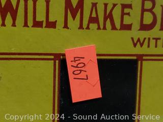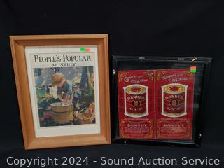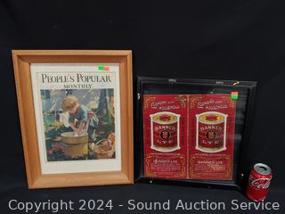 Peoples Popular Monthly 1930, 18.5" x 14" & Economy in the Household Banner Lye, 15" x 15", clips to hold back on frame are not staying in place, falls off.