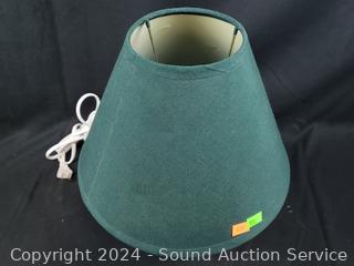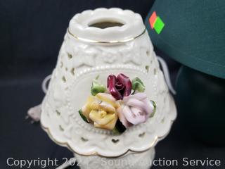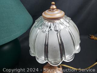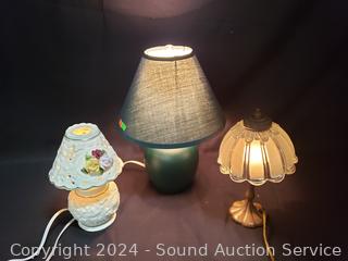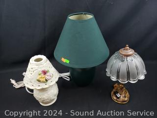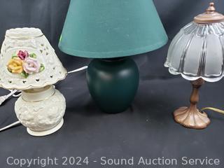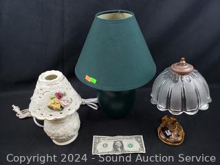 Porcelain w/Porcelain shade 9" H x 5.5" Dia, Green one has some damage on shade, 14" H x 10" Dia., glass shade 10" H x 6" Dia. All appear to be functioning as intended.