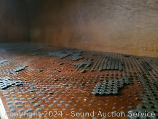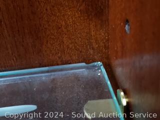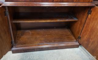 Lighted, glass shelves with plate grooves, beveled glass. Lower door not shutting properly, lower shelf covered in deteriorating shelf liner, otherwise in great condition. 91" H x 72" W x 18" D. Appears to be solid wood construction.