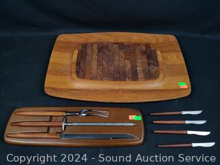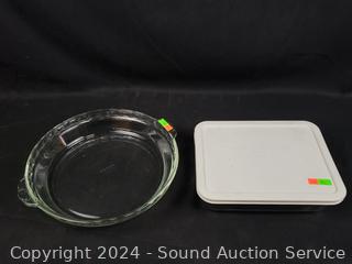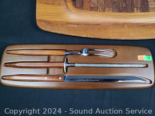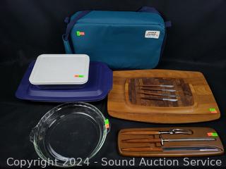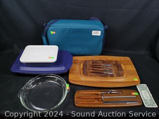 Lot #0191: Pyrex Baking Pans, Carving Set, Wood Cutting Board