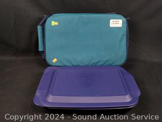 6.5" x 8.5" baking pan w/lid, 9.5" pie pan, 9" x 13" baking pan with carrier & lid, 18" x 12" wood cutting board, Shuredge carving set.