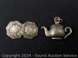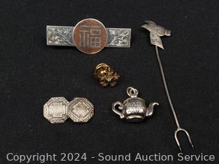 Lot #0111: Sterling Pin, Tie-Clip, Teapot Charm, Buttons