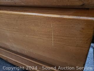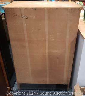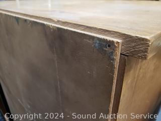 All wood construction, dovetail joinery. Various scuffs, wear to finish. 46" H x 30.5" W x 17" D.