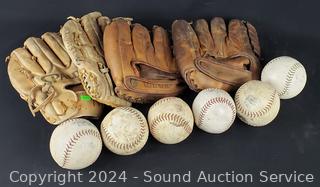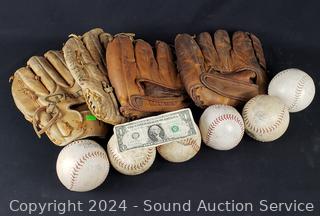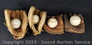 Lot #0173: 4 Vintage Leather Baseball Gloves & 6 Soft Balls