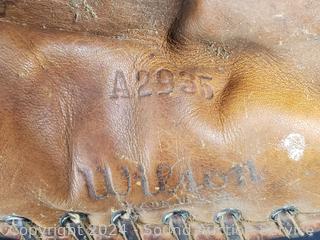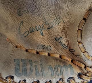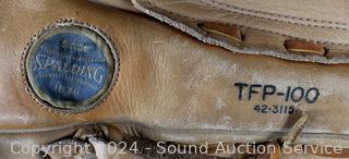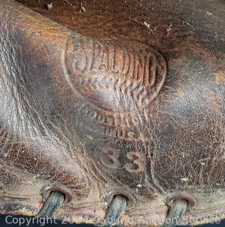 Left hand gloves, Wilson & Spalding, various wear from age, use. One has some writing, one has a hole in finger.