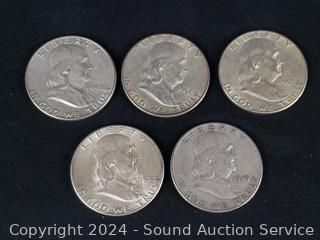 Lot #0087: (5) 1949-54 US Franklin Silver Half Dollars