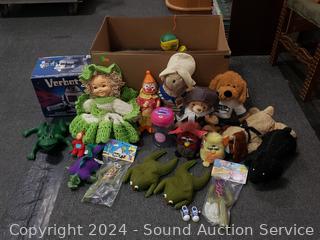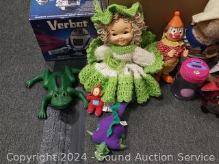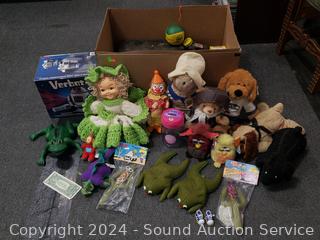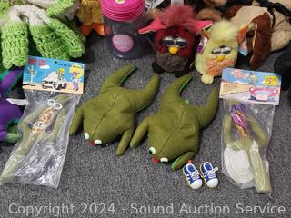 Verbot has no power (very corroded battery compartment), Furby's, Cowboy Cactuses, Knitted doll. Refer to photos for more details.