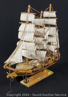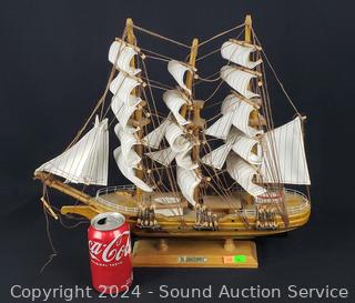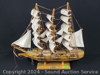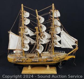 Bowsprit is broken. Dusty from sitting on a shelf. Approx. 17" H x 19" L.