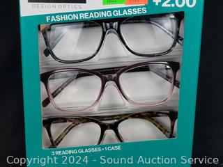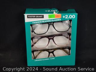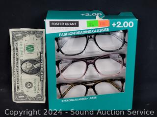 Lot #0185: 3 Foster Grant +2.0 Fashion Reading Glasses w/1 Case