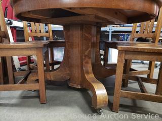 Chairs have old Oregon Chair Co. labels. Approx. 29" H x 48" Dia., (5) 10" leaves. Olde patina finish. Overall good condition given its age.