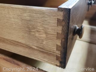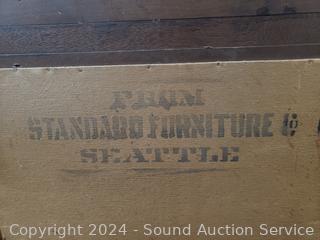 From Standard Furn. Seattle. A few scuffs, worn spots on top, overall great condition. One drawer is felt lined, all wood construction with dovetail joinery. Skeleton key locks, no key. 39.5" to 58.5" H x 45" W x 23" D.