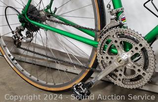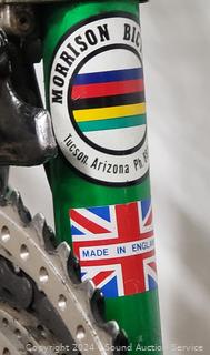 Consigner said it has 531 tubing hand built in England, marked hand built on the frame. Has a mounted bottle holder & bell. Some scuffs, signs of wear from use.