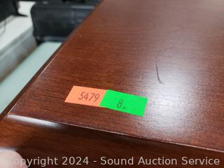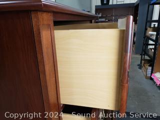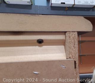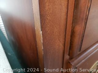Wood fronts, veneer finish, particle board construction. Some scuffs, on bottom corners otherwise great condition. 56" H x 39.5" W x 18" D.