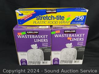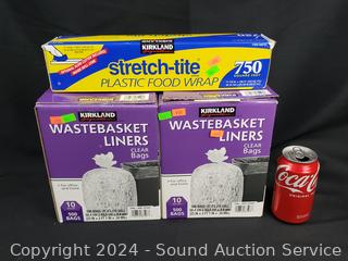 Lot #0143: 2 Boxes of 500 10-Gallon Wastebasket Liners & 750sq.ft. Plastic Food Wrap