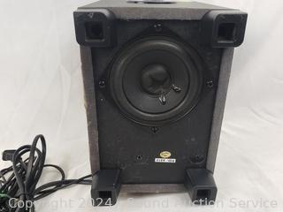 Comes with a spare set of speakers. Has power, appears to be functioning as intended. Some dings, scuffs.