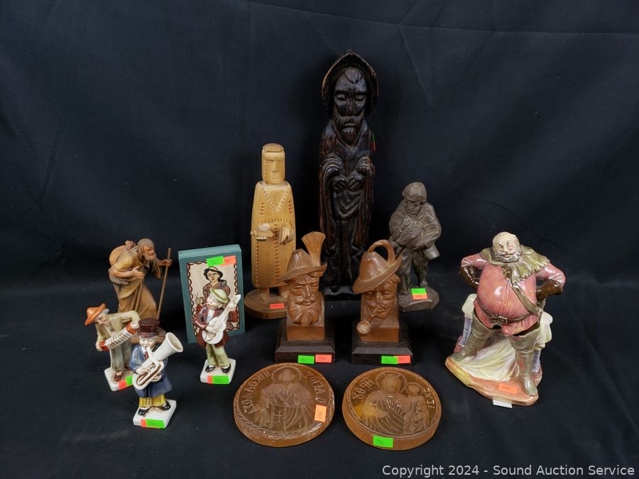 Wood figures look hand carved. Royal Doulton Falstaff figure, San Pasqual signed wood plaque, 3 porcelain musicians. Refer to photos for more details. Approx. 4.75" to 14" tall.