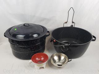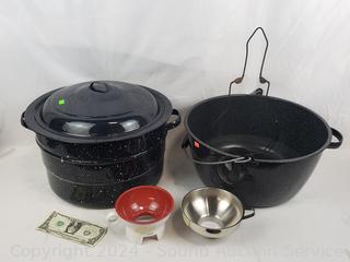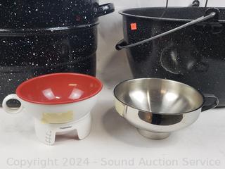7" & 8" H x 14" Dia. 1 lid. 2 canning funnels, pot insert. Signs of wear from use. Refer to photos for more details.