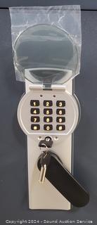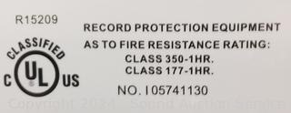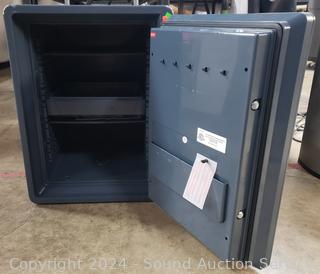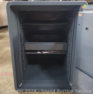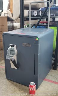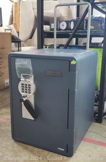 Appears to be functioning as intended. Front top left corner has a dent, otherwise like new condition, complete with manual, keys. 24" H x 17.5" W x 20" D. Has a telescopic handle & wheels for easier movement.