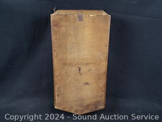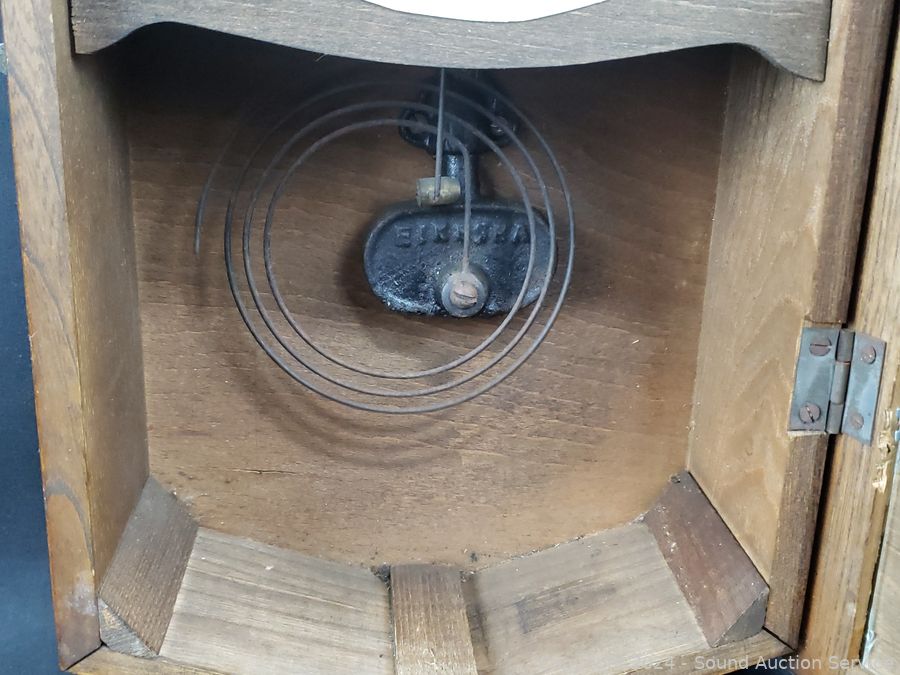 Movement is running but no pendulum so unable to test properly. 15.75" H x 8.5" W x 3.75" D. Various wear to finish, refer to photos for more details.