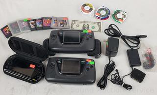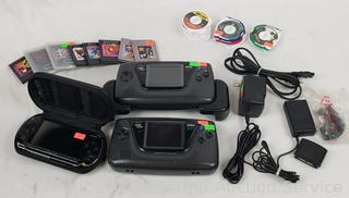 PSP has power, appears to be functioning as intended, Game Gears are Non-functioning, have power, screen on one is broken, screen on the other is black, only one power supply. Comes with 2 SD cards, 6 Game Gear games, 2 Gameboy games, 13 PSP movie, 5 PSP games (1 is broken/damaged). Refer to photos for more details.