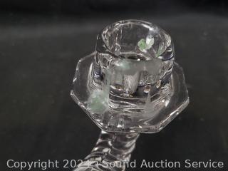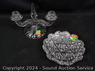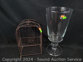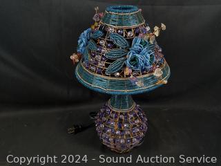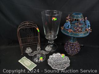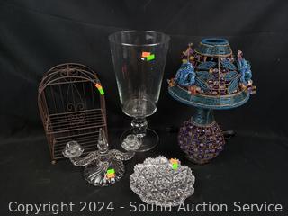 Lot #0215: Wire Frame Beaded Lamp Vase, Candleholders, Dish, Shelf