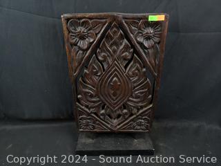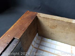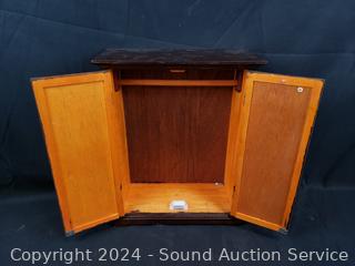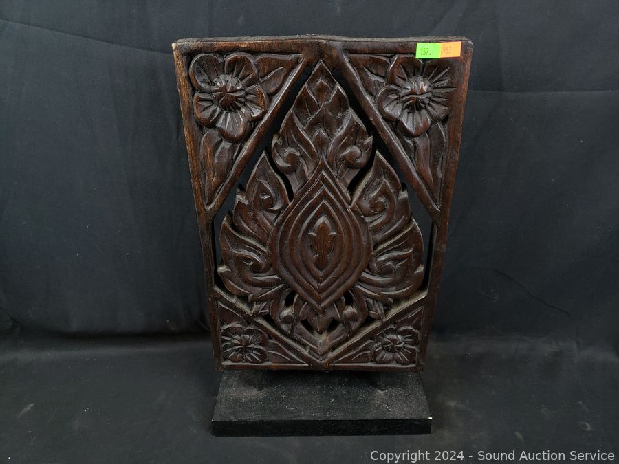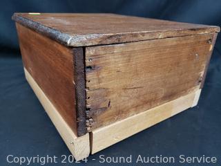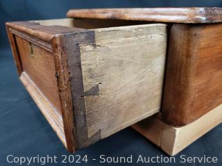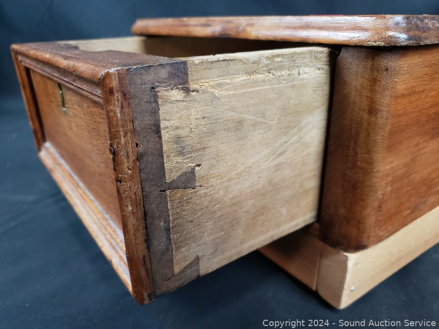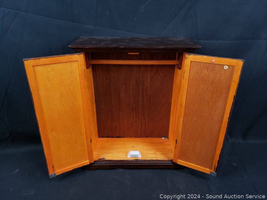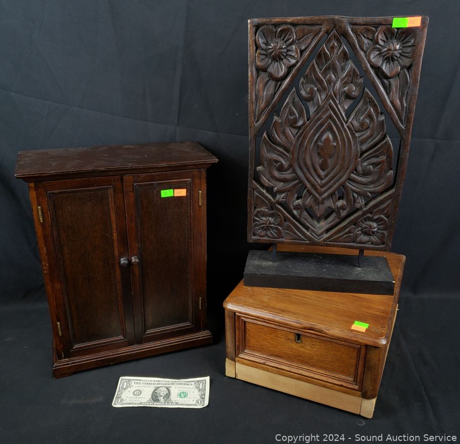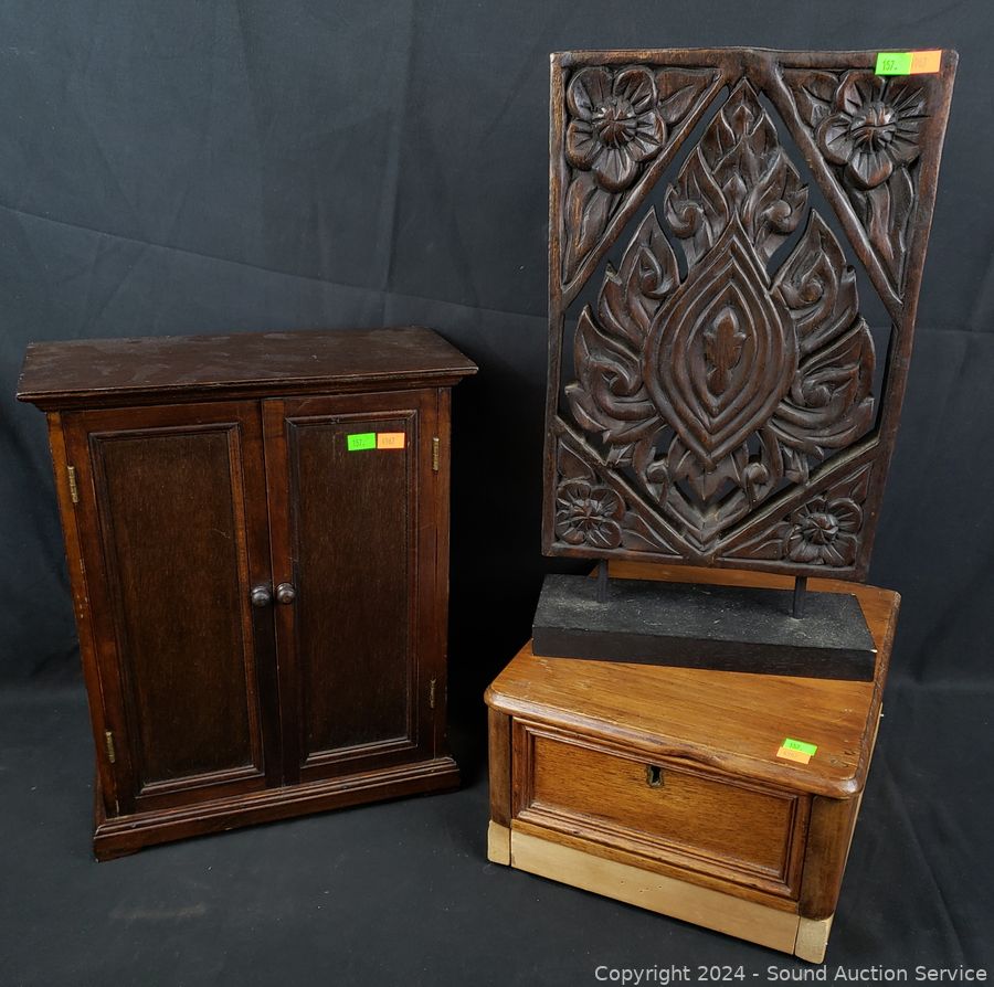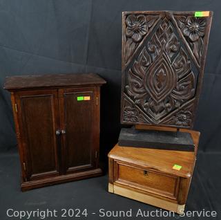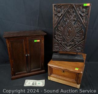 Lot #0157: Wood Doll Armoire, Carved Wood Sculpture, & Wood Drawer