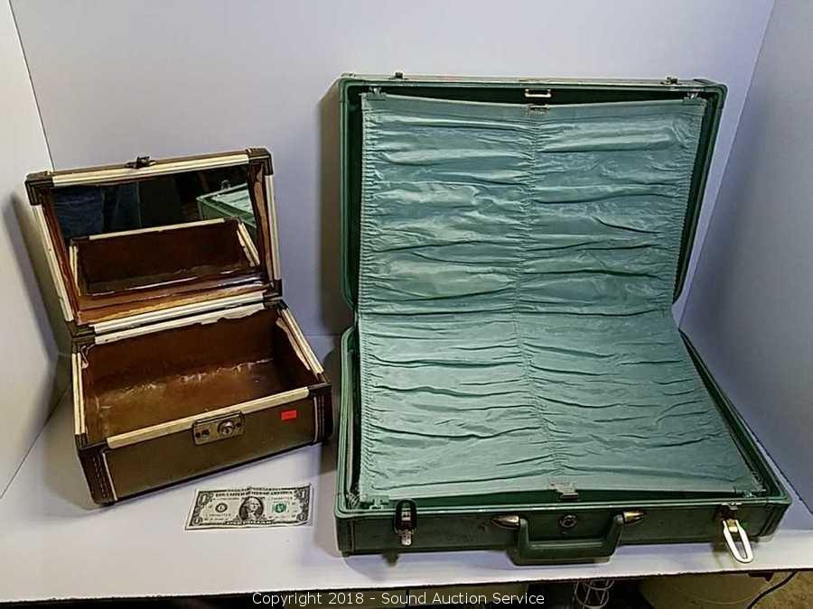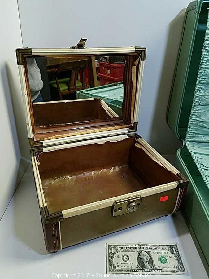 One is by Taborlite, some scuffs and scrapes, some stains and tears on the interior. Smaller one has a mirrored lid. No keys. Approx. 7" x 12" x 9.5" and 15" x 21" x 7".