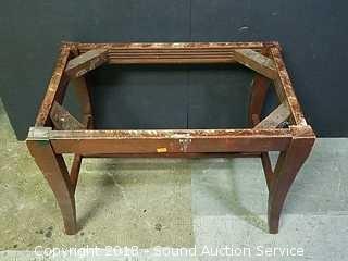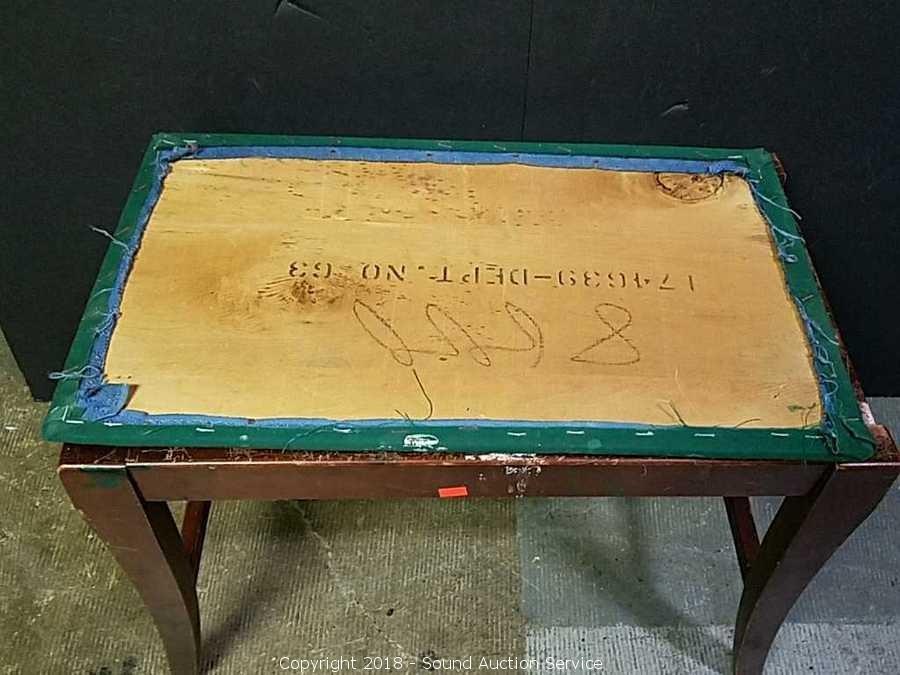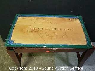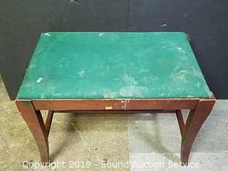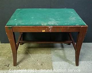 Some staining on the upholstery, would be easy to reupholster. Top just sits on bench. Approx. 18" tall, 23" x 14".